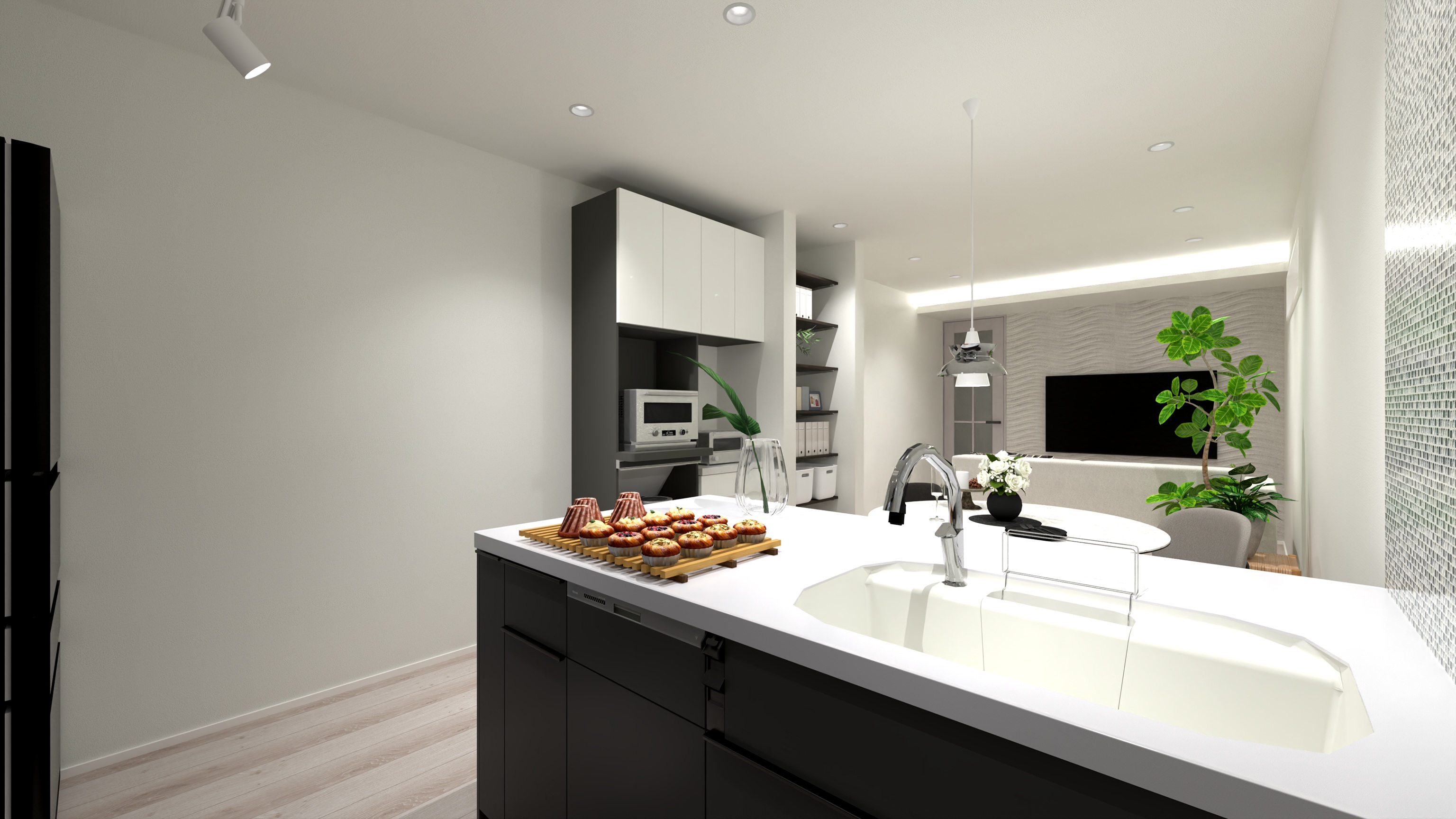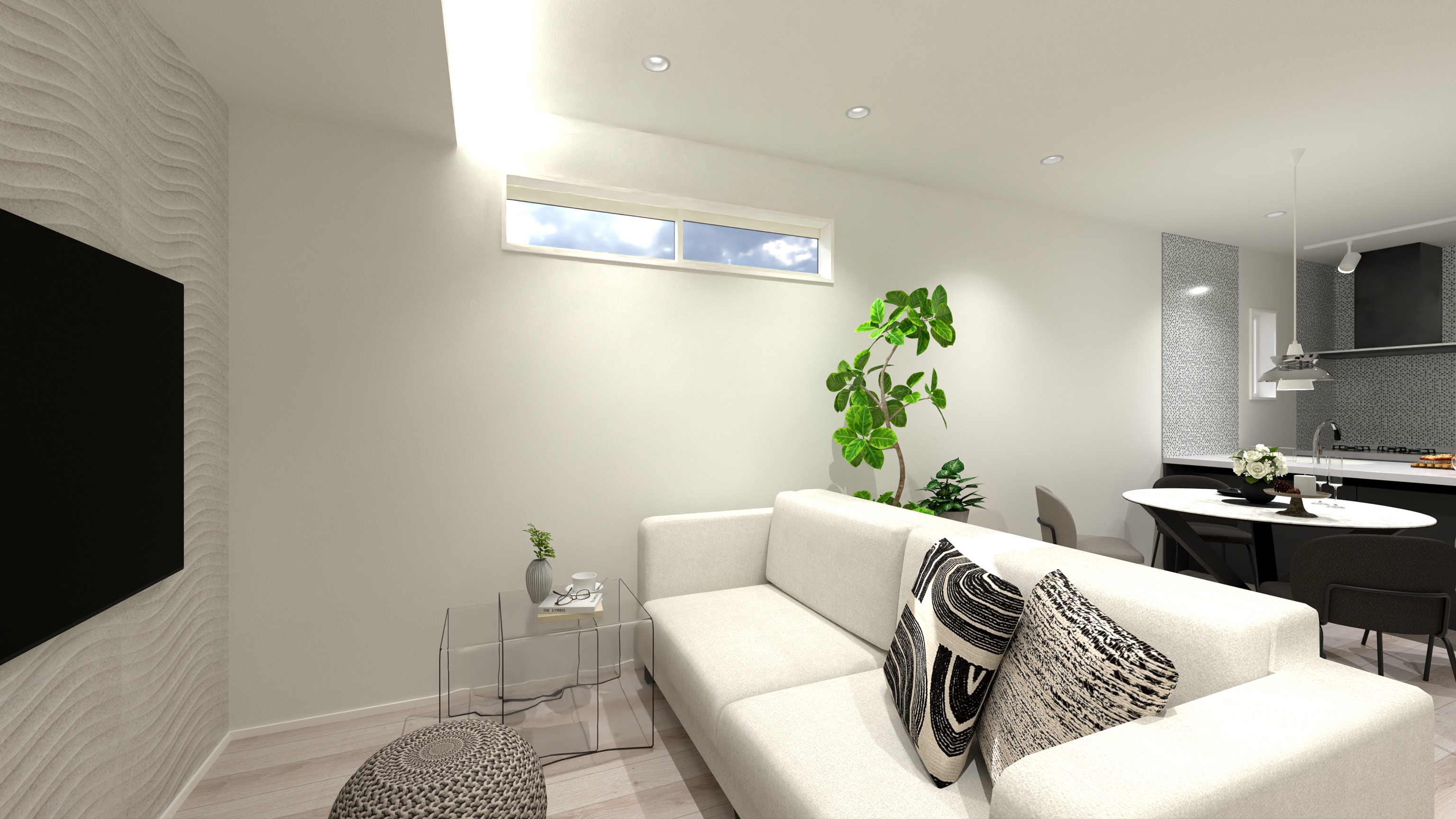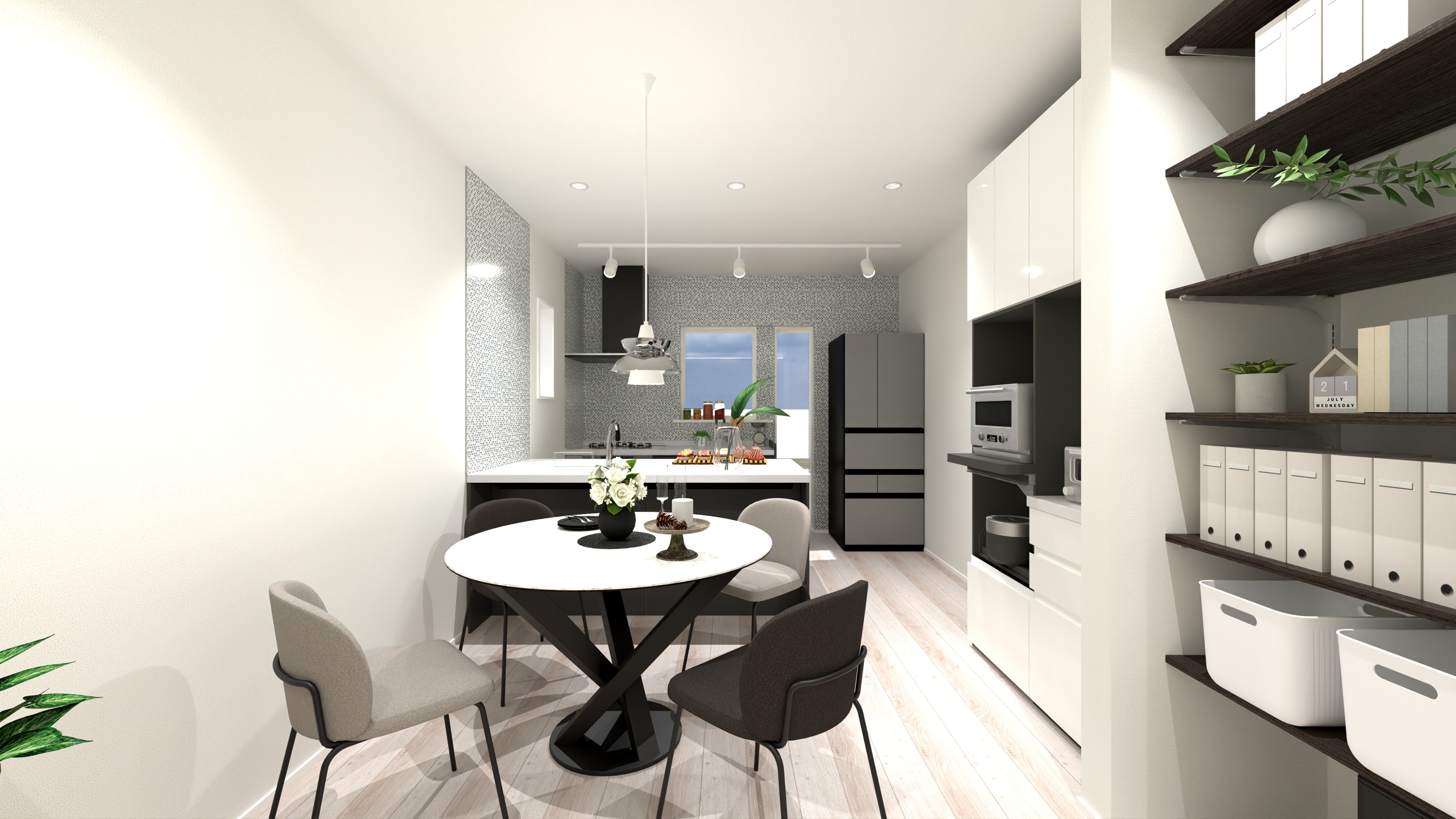 キッチンがリビング入口から離れているため、生活感を感じさせにくいのも魅力な間取り配置。