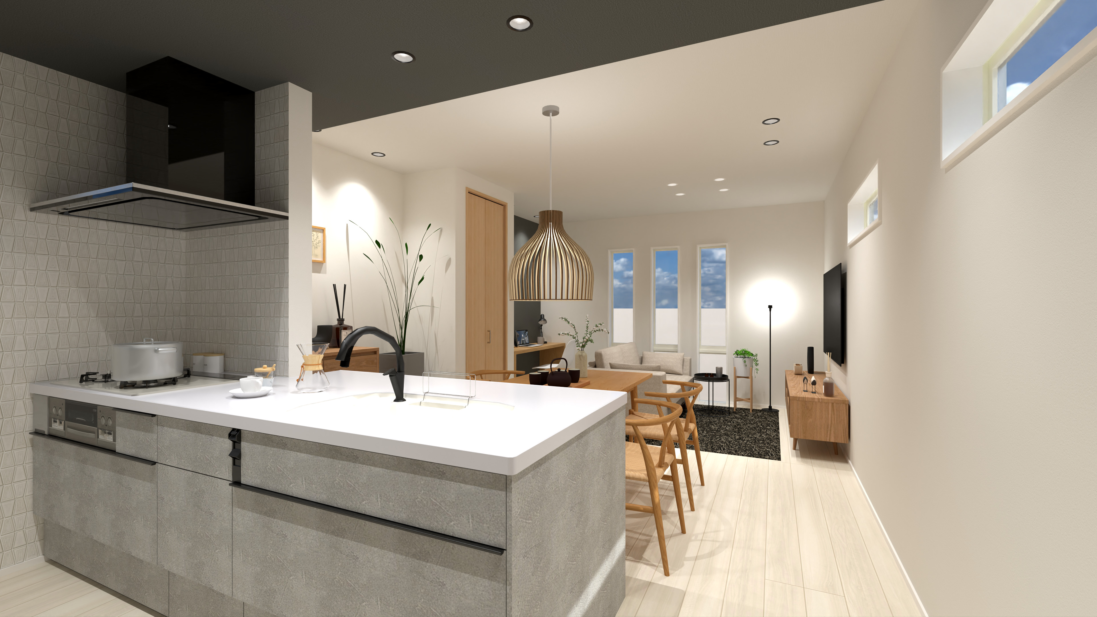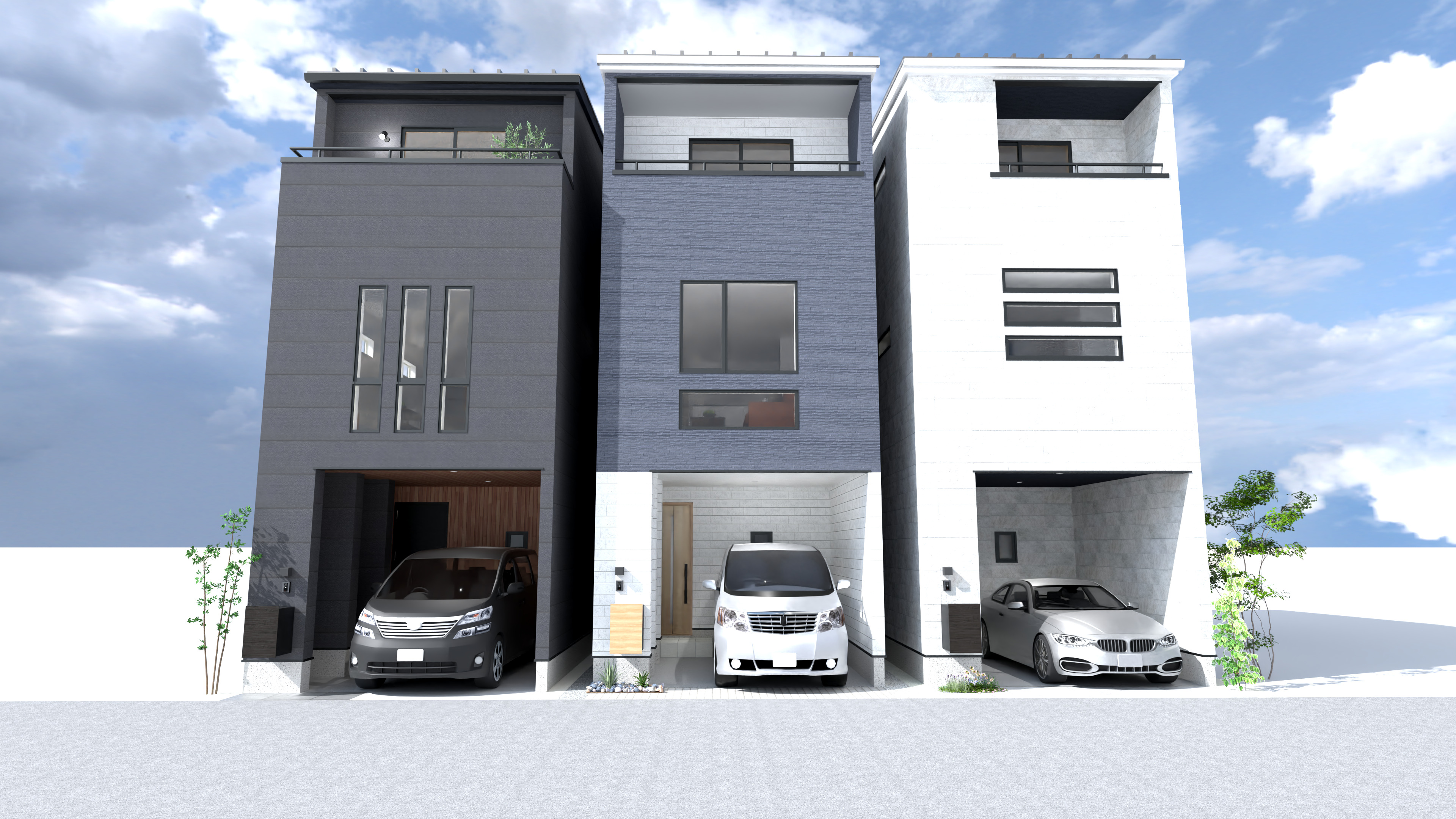 完成予想パースではありますが、建売住宅ながら各戸特徴のある三者三様の表情になるようデザインにもこだわります。