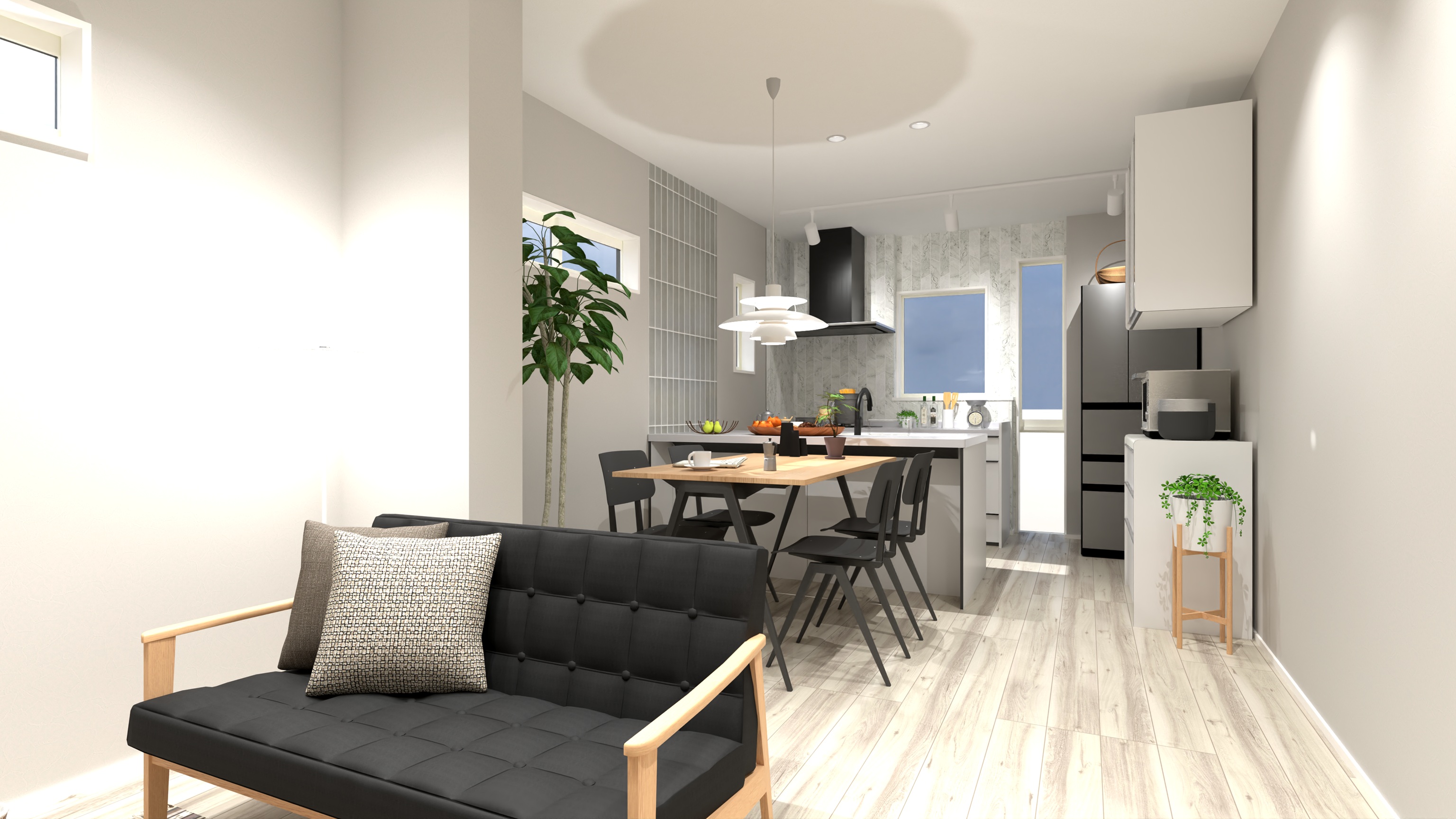 キッチンがリビング入口から離れているため、生活感を感じさせにくいのも魅力な間取り配置。