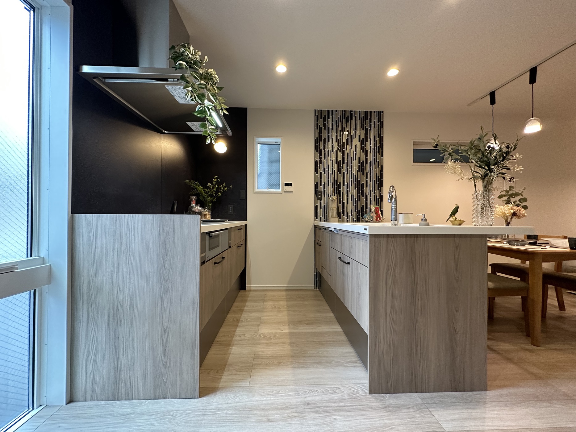 家事をしながらLDK全体が見渡せ、光と風を取り込める窓辺のキッチンは作業効率に優れたⅡ型を採用。
